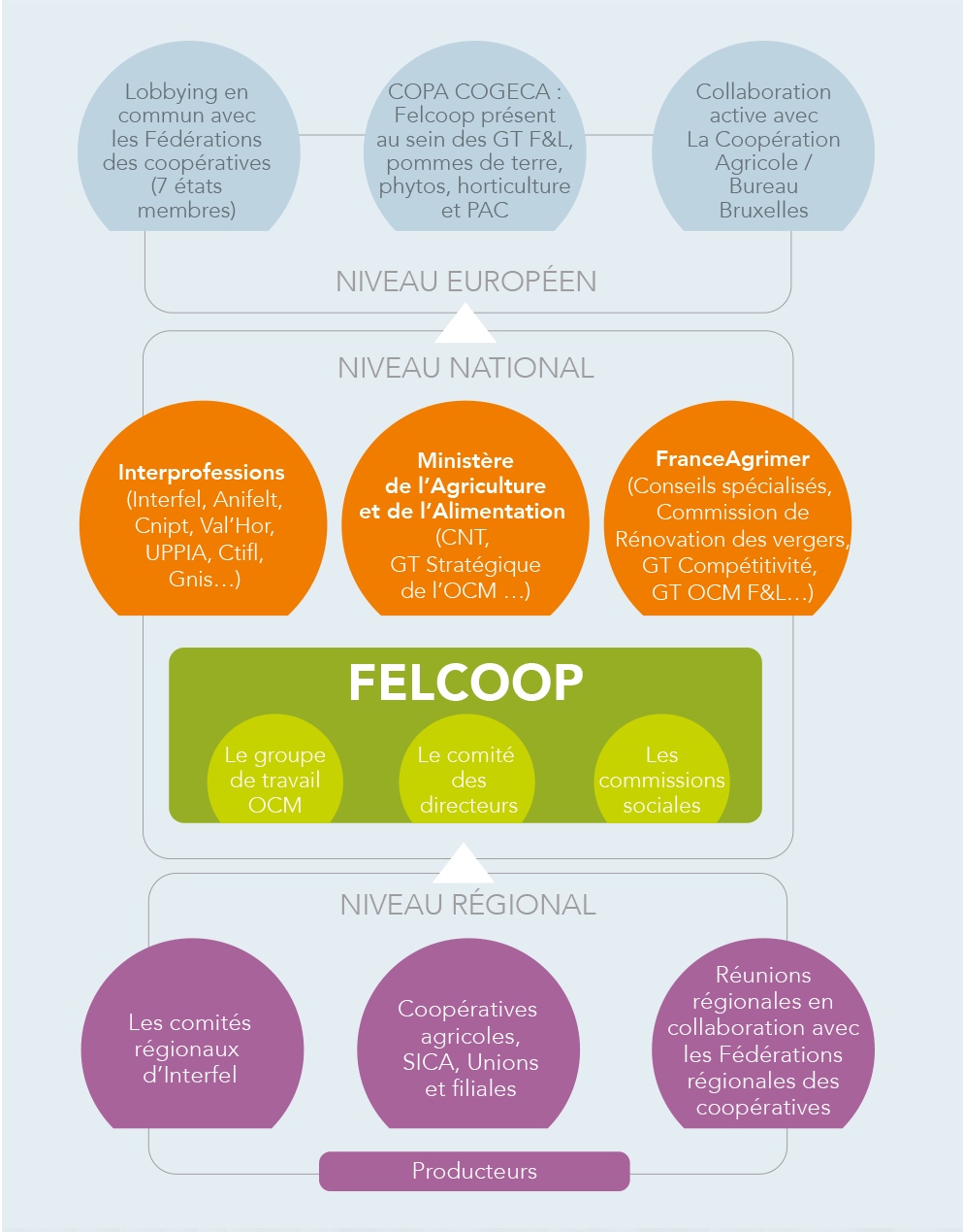 Nous défendons et représentons les intérêts de nos adhérents dans de nombreuses instances et à différents niveaux, et défendons les spécificités coopératives des OP :